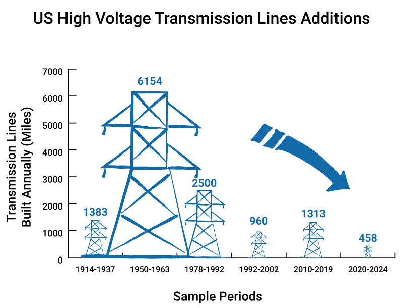 New transmission line construction in the United States has slowed to a crawl—at exactly the moment when electricity demand is accelerating. As the chart shows, we once routinely added thousands of miles of high-voltage lines per year. Today, additions are a fraction of historic levels, even as data centers, AI, electrification, and manufacturing resurgence strain the grid like never before.